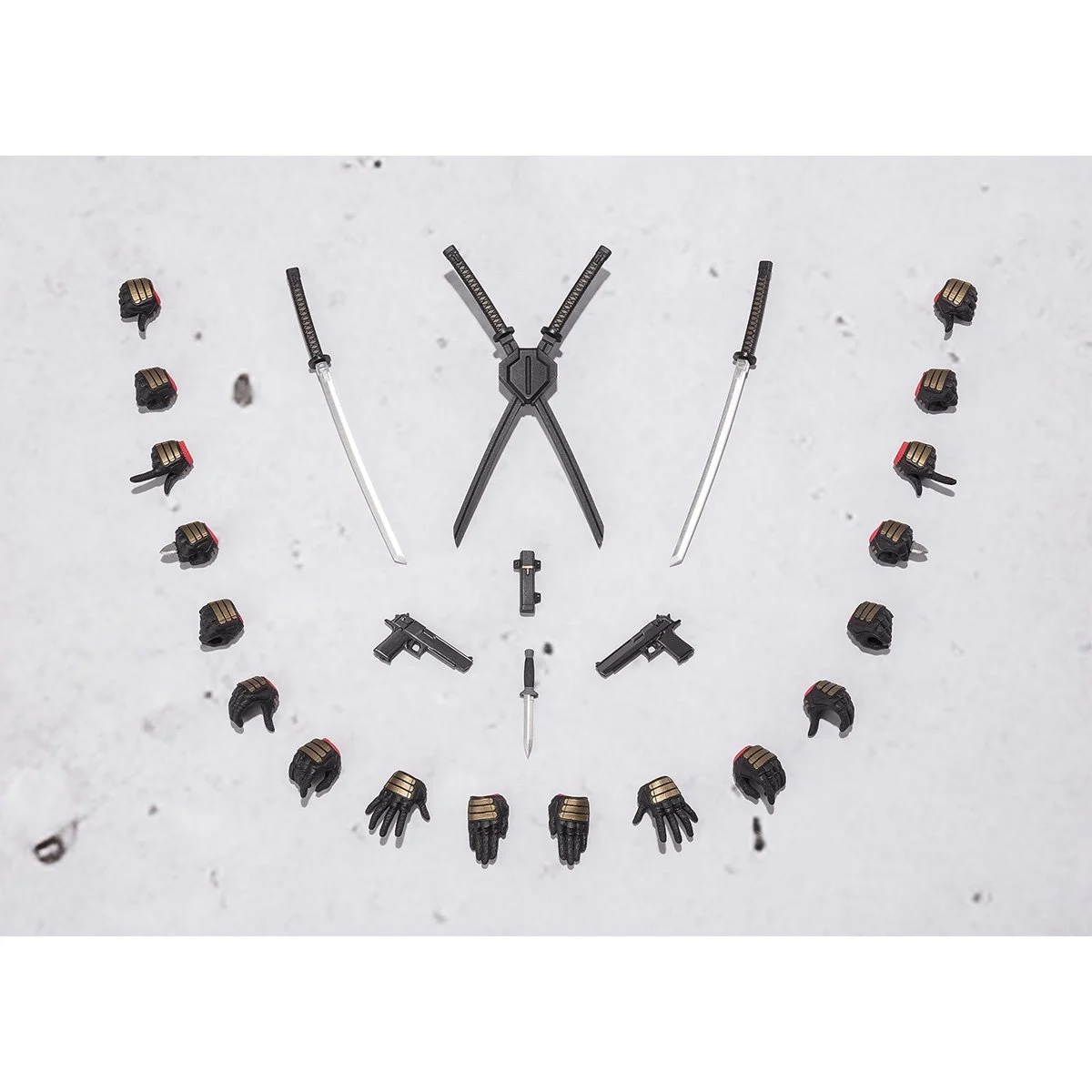 Deadpool isn’t showing up empty-handed. This figure includes: