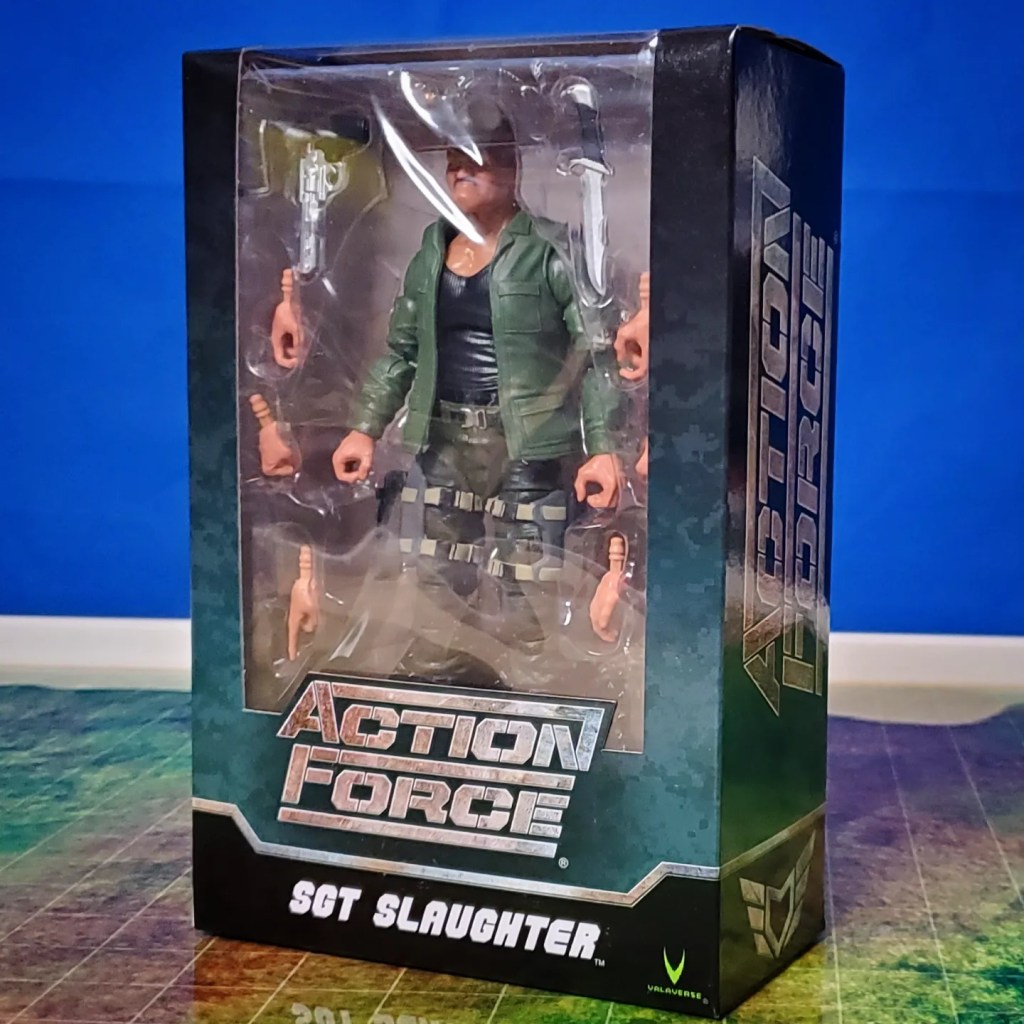 Valaverse’s Sgt. Slaughter action figure is nice. The box is perfect for in-box collectors. A nice large plastic window shows everything included inside the box. The left side of the box shows off the large Action Force logo while the right has some nice Sarge artwork. The back brings it all together with a classic layout. It shows us the images of other figures in the wave. A link to the website through a QR code. But for those of us who get a kick from nostalgic callouts, they included file cards and action points for future promotions!
