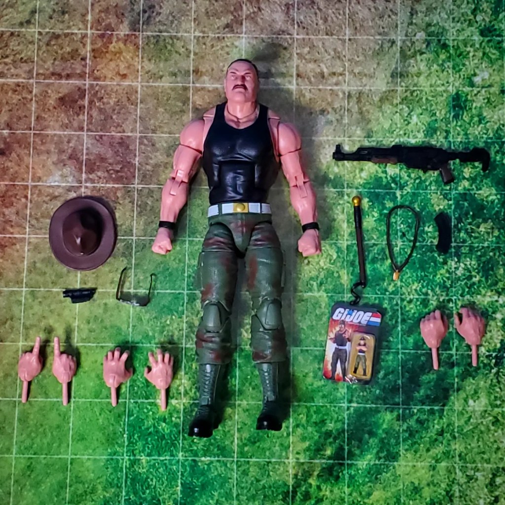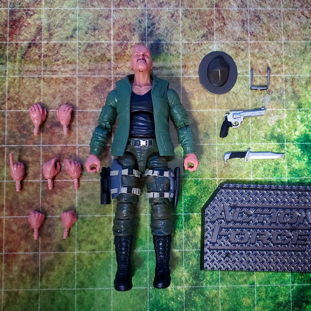 The figure is a little stiff out of the box. A warm water bath would probably be recommended before posing. Articulation is great but not perfect. Usual ball joints, rockers, and swivels. Where it becomes a problem is when the joints are encumbered by plastic. As an example, the butterfly joint is useless because of Sarge’s military jacket. Accessories include 7 different hands, a pistol, a knife, sunglasses, a military fedora, and an Action Force stand.